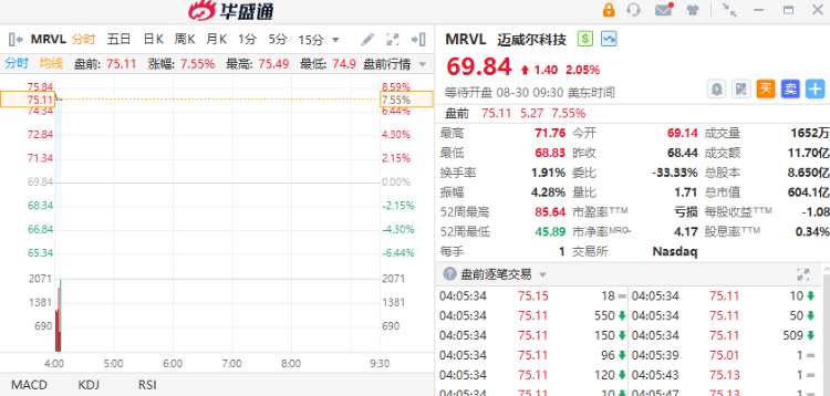 芯片股盘前走强,迈威尔科技涨近8%,英特尔涨超3%,意法半导体、英伟达等涨超1%。