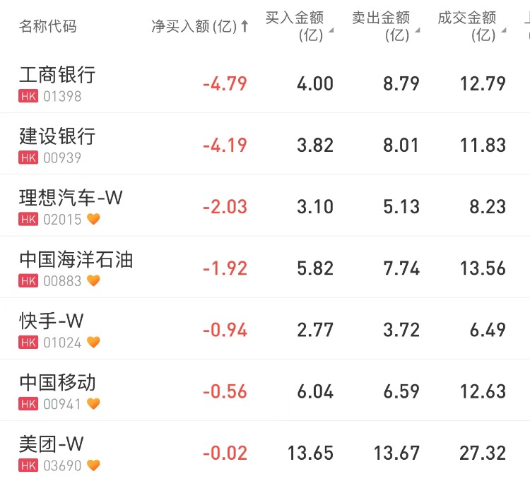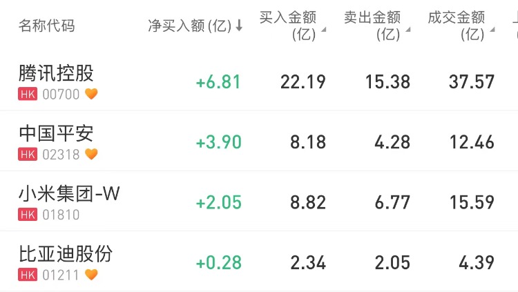腾讯控股、中国平安、小米集团-W分别获南下资金净买入6.81亿港元、3.9亿港元、2.05亿港元;工商银行、建设银行分别遭净卖出4.79亿港元、4.19亿港元。