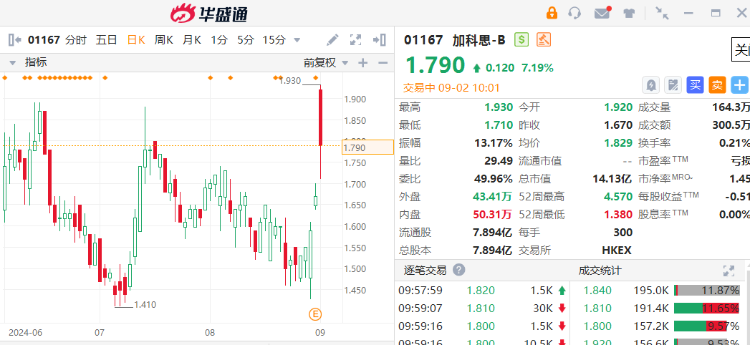 加科思-B $01167.HK 涨超7%,截至发稿,涨7.19%,报1.79港元,成交额300万港元。