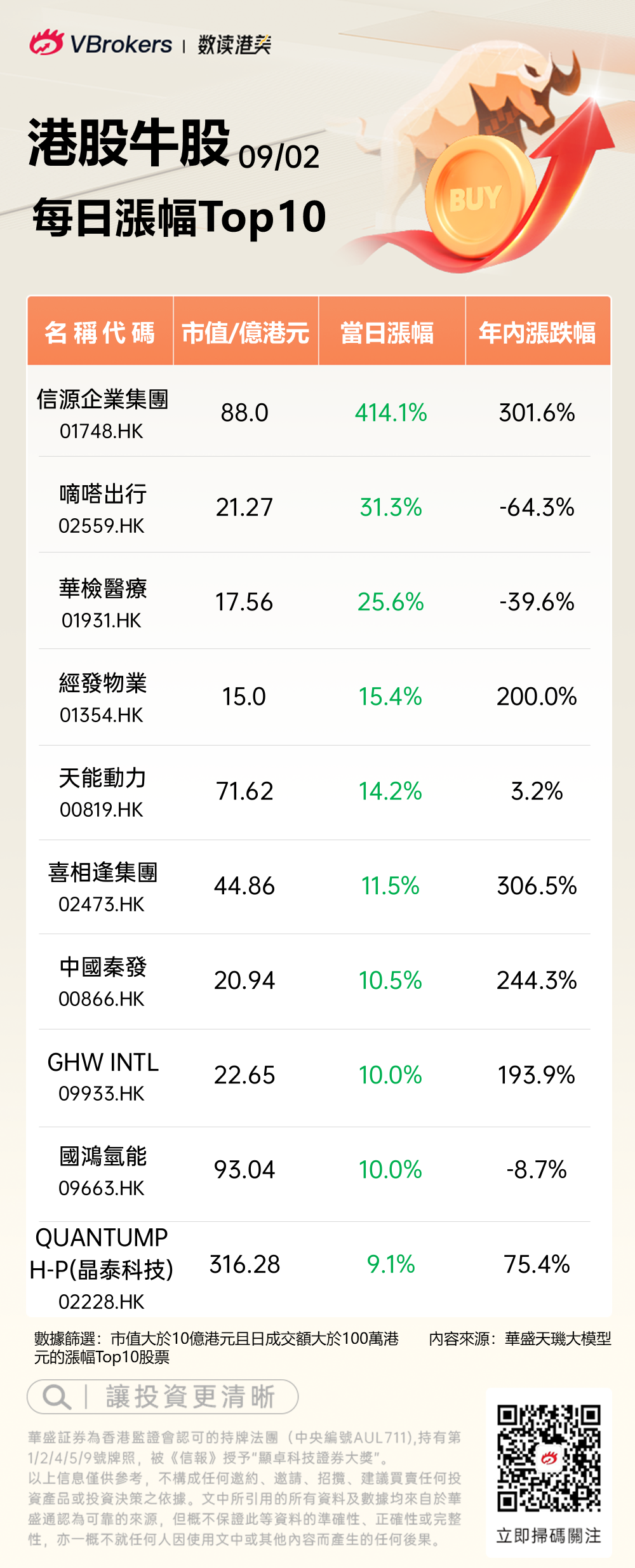 發仔统计了每日港股涨幅Top10,具体名单如下: