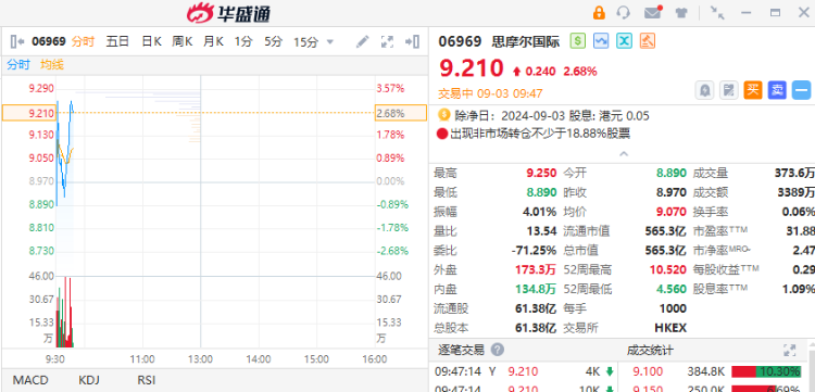 9月3日,思摩尔国际(06969)早盘走高,截至发稿,涨2.68%,报9.21港元,成交额3389万港元。