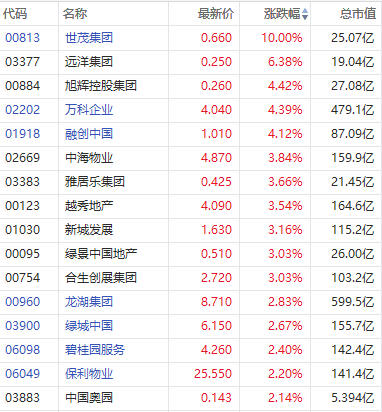 9月3日,内房股逆市走高,截至发稿,世茂集团涨10%,远洋集团涨超6%,旭辉控股集团、万科企业、融创中国涨超4%,越秀地产、新城发展涨超3%。