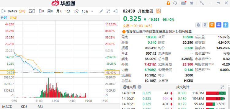 与此同时,升能集团的总市值也出现大幅缩水,从昨日收盘的204.5亿港元降至目前的3.283亿港元。