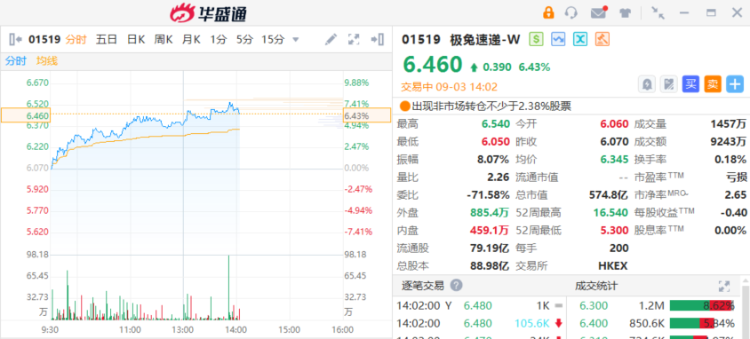 极兔速递-W $01519.HK 涨超6%,截至发稿,涨6.43%,报6.46港元,成交额9243万港元。