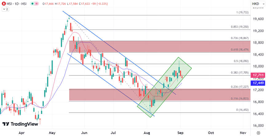 恒指自突破中期下行通道以来主要趋势向上,不过上周短暂测试万八关口后再次调整,当前看是否能继续守住20日均线,以避免回到17000关口下方,并再次展望回升的动力,否则空头会再次占据主导,并以16800至16500区间为目标。
