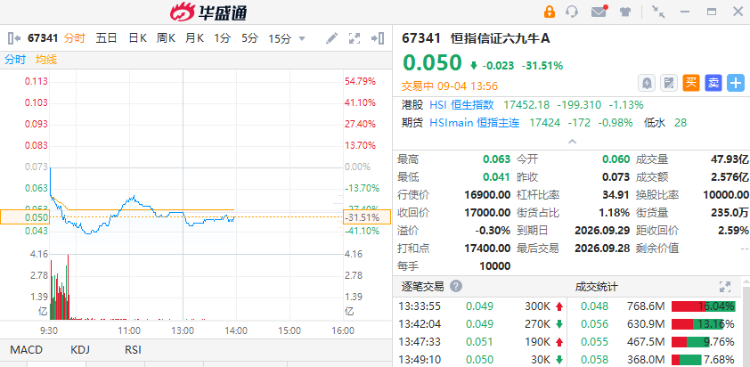 即市资金流方面,大市早段显著向下,好友积极入场,即市17,000点或以下的牛证都是热门选择之一,包括恒指牛证 $67341.HK ,收回价17,000点,实际杠杆约40倍,以及另一只恒指牛证 $67673.HK ,收回价16,800点,实际杠杆约27倍。熊证方面,淡仓较多资金食糊离场,亦有个别资金追入较贴价的熊证,以获取更高杠杆,包括恒指熊证 $68853.HK ,收回价17,800点,实际杠杆约31倍。