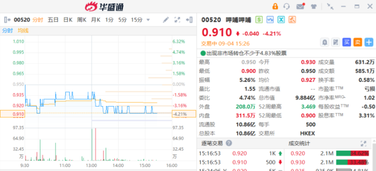 呷哺呷哺 $00520.HK 盘中跌超45%,触及历史低点0.9港元,截至发稿,跌4.21%,报0.91港元,成交额585万港元。