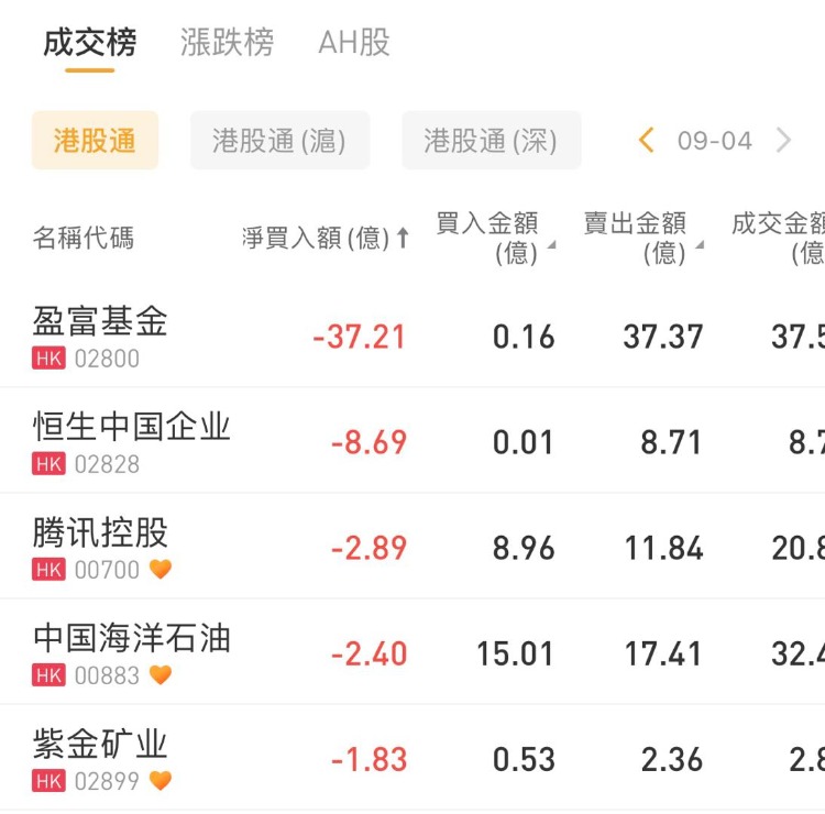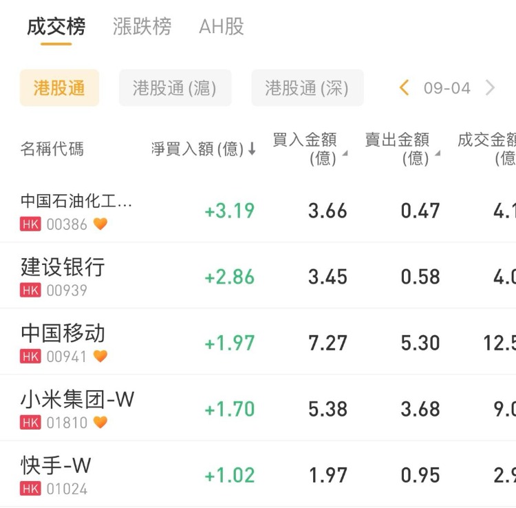 中国石油化工股份、建设银行、中国移动分别获南下资金净买入3.19亿港元、2.86亿港元、1.97亿港元;盈富基金、恒生中国企业、腾讯控股分别遭净卖出37.21亿港元、8.69亿港元、2.89亿港元。