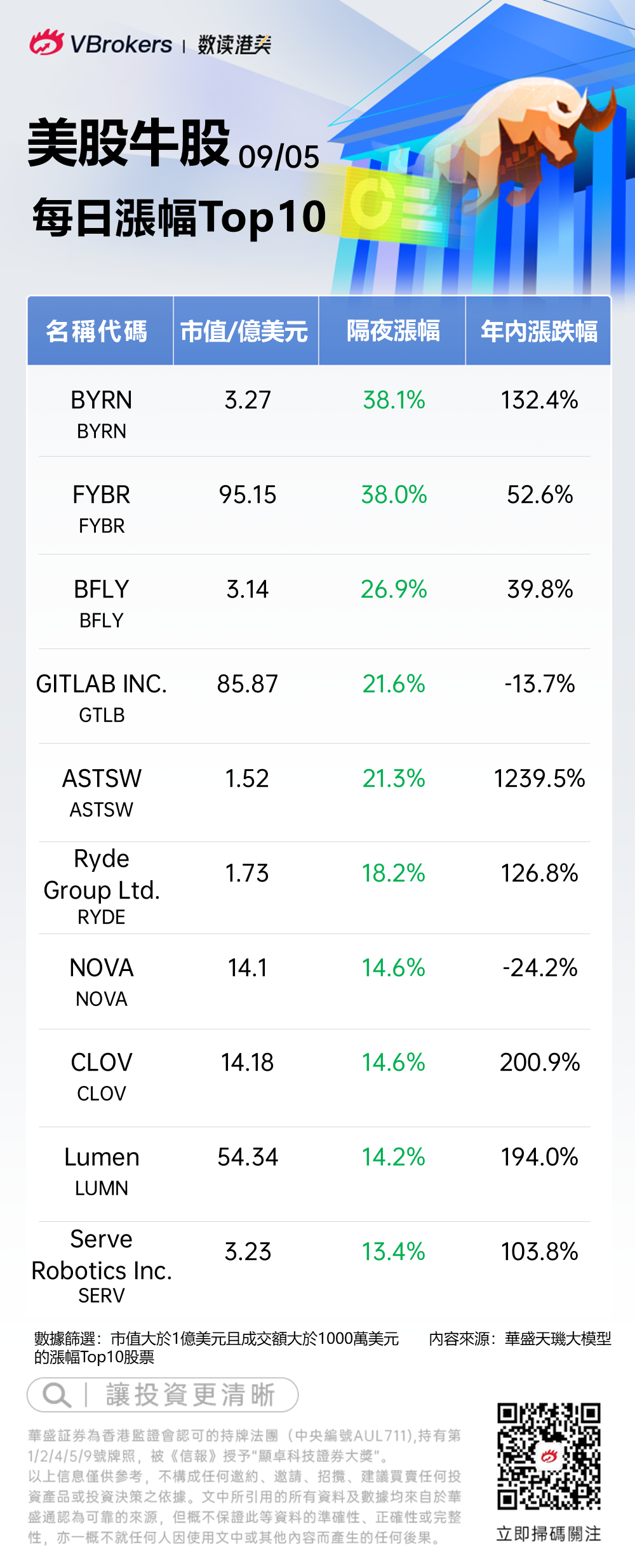發仔统计了每日美股涨幅Top10,具体名单如下: