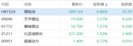 锂业股早盘回暖,截至发稿, 天齐锂业 $09696.HK )涨3.27%,赣锋锂业 $01772.HK 涨1.21%。