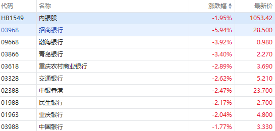 内银股走势疲软,截至发稿,招商银行跌5.94%,青岛银行跌超3%,交通银行跌超2%,中国银行跌超1%。