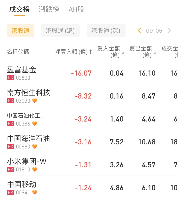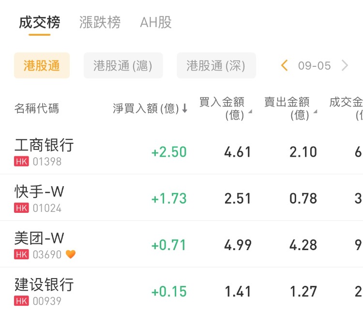 工商银行、快手分别获南下资金净买入2.50亿港元、1.73亿港元;盈富基金、中国石油化工股份、中国海洋石油分别遭净卖出16.07亿港元、3.24亿港元、3.16亿港元。