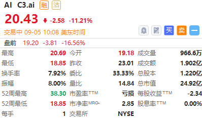C3.ai $AI 跌逾11%,公司上财季订阅收入逊于预期,何时盈利仍未知。