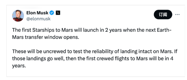 马斯克写道,这些飞船将是无人驾驶的,以测试在火星上完整着陆的可靠性。他补充称,如果它们顺利着陆,那么SpaceX将在四年内首次向火星发射载人飞船,这将是一个关键节点,因为自那时起飞船的发射率将呈指数级增长。