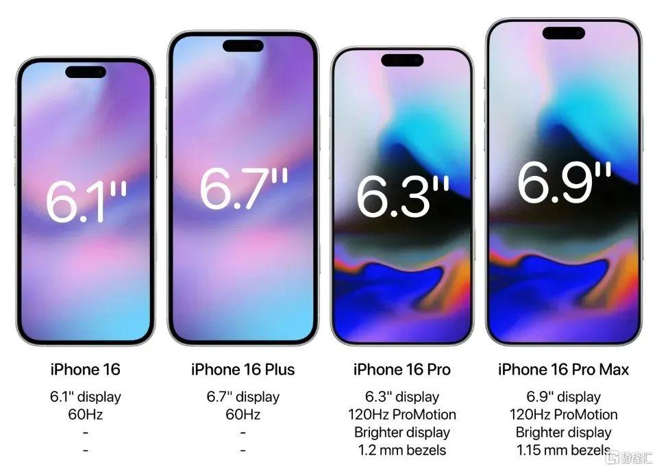 iPhone 16系列预计将推出四款新型号:iPhone 16、16 Plus、16 Pro 和 16 Pro Max。Pro版本将配备更大的显示屏,尺寸分别为6.3英寸和6.9英寸,边框将缩小约三分之一,使得整体外观更加时尚。