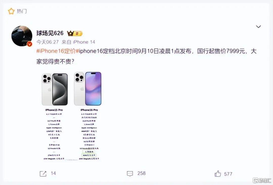 价格才是大家关心的,iPhone16据说是5999元起售,而iPhone16pro的大陆地区的最低售价为7999元。已经有博主得到了消息: