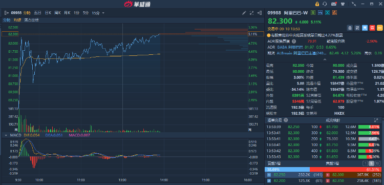 阿里巴巴-W港股股价震荡走高,现涨超5%报82.30港元。