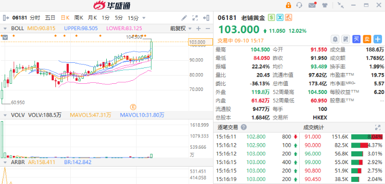 老铺黄金(6181.HK)午后涨幅扩大至超12%,报104.5港元创上市新高价,总市值超170亿港元。消息上,沪深交易所发布通知,因恒生综合大型股指数、中型股指数、小型股指数实施成份股调整,港股通标的名单发生调整。其中,老铺黄金获纳入港股通名单。此外,信达证券日前指出,公司为稀缺的高端古法金品牌,有望在未来3年兑现显著快于同业的业绩增长,享受一定估值溢价。