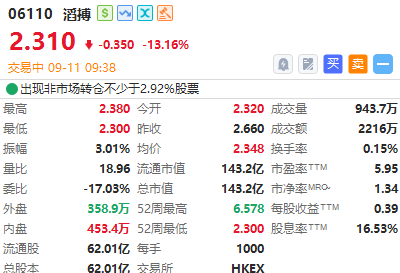 滔搏(06110)盈警后低开,截至发稿,跌13.16%,报2.3港元,成交额2216万港元。