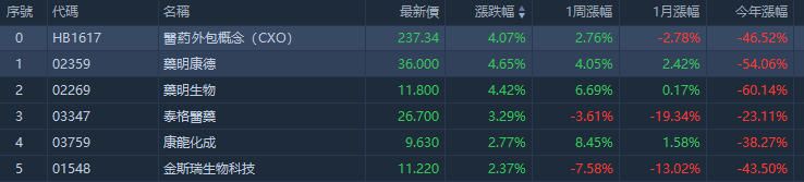 CXO概念股早盘继续走高,截至发稿,药明康德(02359)涨4.65%,报36港元;药明生物(02269)涨4.42%,报11.80港元;凯莱英(06821)涨3.84%,报41.95港元;康龙化成(03759)涨2.77%,报9.63港元。