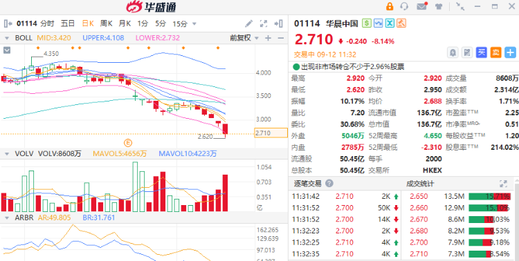 华晨中国(1114.HK)盘中一度大跌超11%至2.62港元,股价创4月初以来新低。