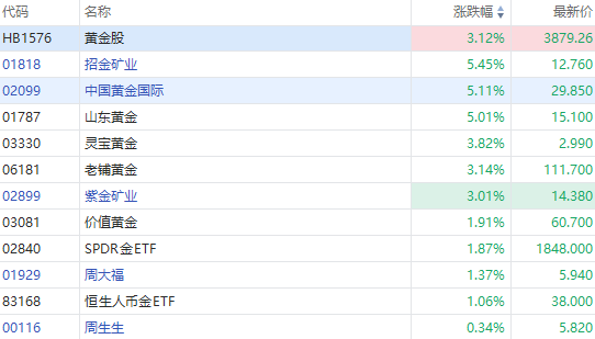 黄金股集体走高,截至发稿,招金矿业、山东黄金、中国黄金国际涨超5%,灵宝黄金、老铺黄金涨超3%。