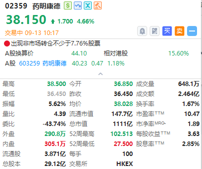 药明康德(02359)盘中再度走高,截至发稿,该股涨超4%,报38.15港元;周内累计大涨超10%。