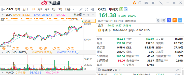 此外,甲骨文绩后获华尔街大行上调目标价,花旗发表报告报告指,甲骨文在一般季节性因素较强的首财季中预订量持续强劲,收入及盈利比起上季稍好,该行将甲骨文目标价由140美元升至157美元,维持“中性”评级。美银证券将甲骨文的目标价由155美元上调至175美元,重申对其“中性”评级,认为公司的云端业务续推高RPO表现。