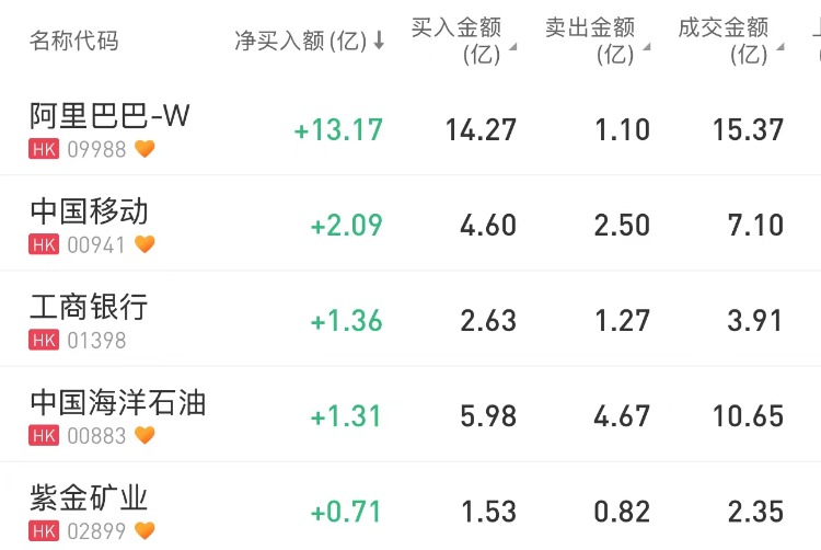 阿里巴巴-W、中国移动分别获南下资金净买入13.17亿港元、2.09亿港元;盈富基金、美团-W分别遭净卖出7.77亿港元、6.65亿港元。