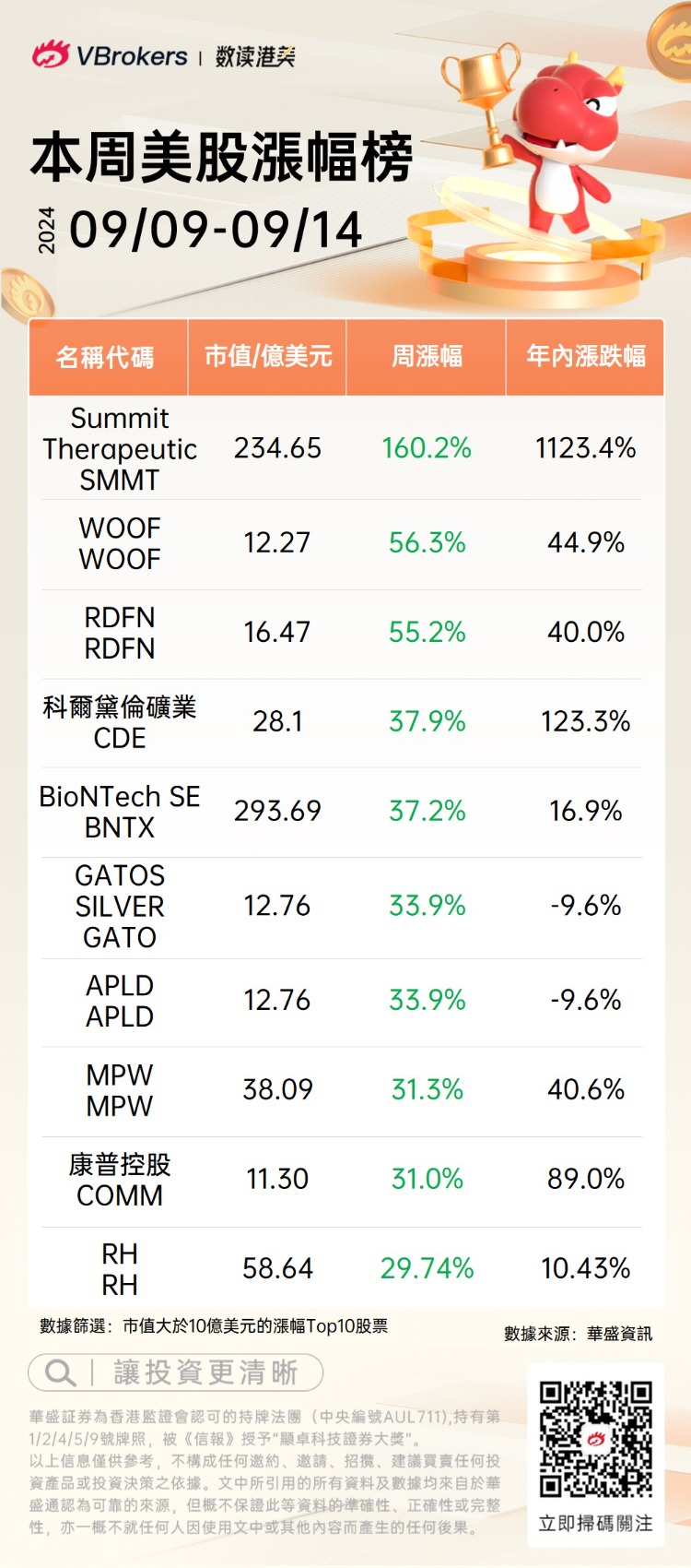 华盛资讯2024年09月14日讯,本周道琼斯指数涨幅2.6%,报41393.78点;纳斯达克指数涨幅5.95%,报17683.98点;标普500指数涨幅4.02%,报5626.02点。發仔梳理了每周美股涨跌幅Top10榜单,供投资者参考。