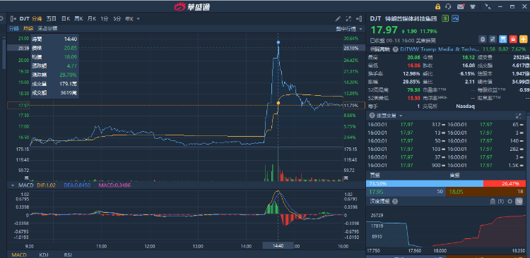 此言一出,特朗普媒体科技集团股价周五快速飙升30%,截止当天收盘,涨幅缩窄至12%,收于17.97美元。