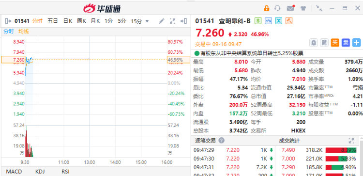 9月16日,宜明昂科-B(01541)高开,截至发稿,涨46.96%,报7.26港元,成交额2660万港元。