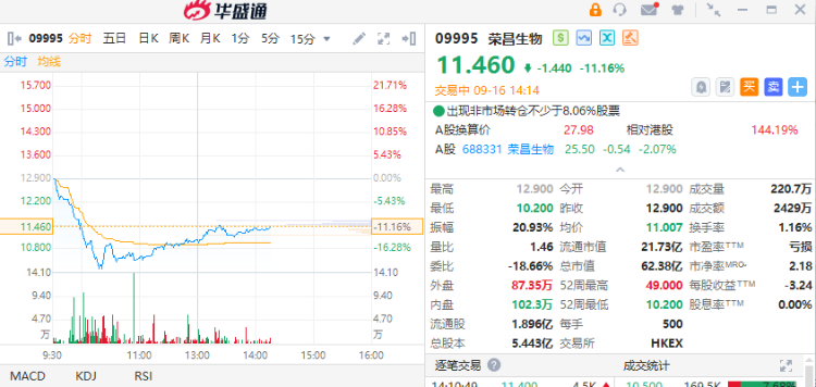 9月16日,荣昌生物(09995)盘中一度跌超20%,截至发稿,跌11.16%,报11.46港元,成交额2429万港元。