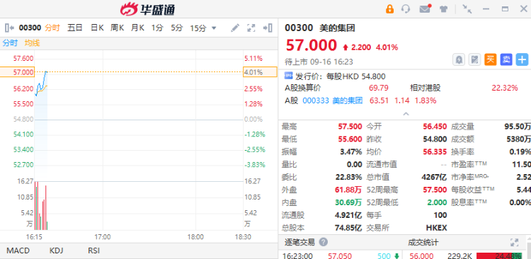 华盛资讯9月16日讯,港股美的集团正在暗盘交易中,截至发稿涨4.01%,报57港元/股,中签一手账面浮盈220港元,最新总市值4267亿港元。该股预计将于9月17日正式挂牌上市,配售结果将于今日晚间披露。