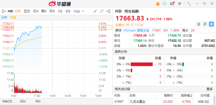 中秋节(9月17日),港股正常开市,恒生指数、恒生科技指数集体低开高走,截至发稿,恒指涨1.39%,国企指数涨1.36%,恒生科技指数涨1.08%。