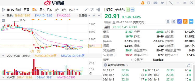 为此,英特尔CEO基辛格专门发布了告员工书,阐明了英特尔未来的发展方向、进展,以及对于晶圆代工厂和Altera的安排,这一封信终于让英特尔的股价有了起色,发布后,股价猛拉6.36%,盘后再大涨7.99%,见下图。