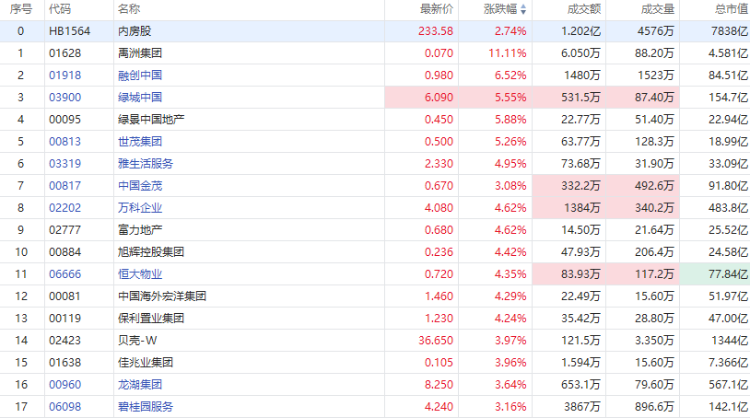 周四港股早盘,内房股集体大涨,截至发稿,禹洲集团大涨逾11%,融创中国涨超6%,绿城中国、世茂集团涨超5%,雅生活服务、万科企业、富力地产等涨超4%。