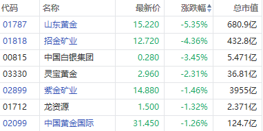 9月19日,黄金股普遍低开,截至发稿,山东黄金跌超5%,招金矿业跌超4%,中国白银集团跌超3%,灵宝黄金跌超2%,中国黄金国际跌超1%。