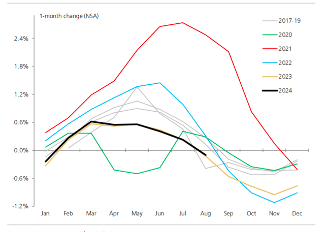 图:尽管8月份OER有一次意外的跳涨,但是未来预期OER将稳步下行,继而拉动核心CPI继续下行。