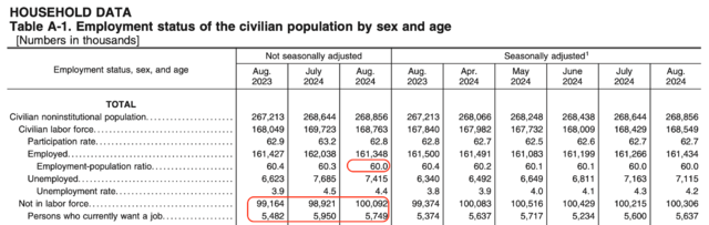 具体而言,8月份不在劳动力市场中的人数出现了明显上升,超过了1亿美国人,较7月份飙升了接近120万人;同时正在找工作的人较上月也骤降了约20万人;而就业/人口比例也从上个月的60.3,骤降到60.0。