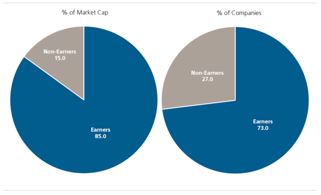 图:美国罗素2000指数中盈利为负值的企业占到总市值的15%;从数量上来看,在罗素2000里27%上市企业现在都不盈利
