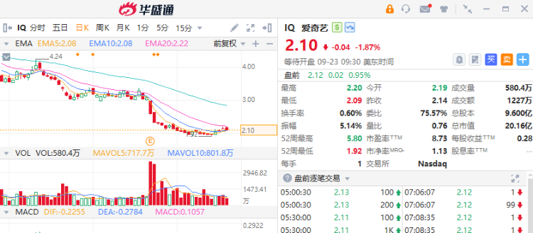 爱奇艺股价在业绩报告发布后连续两个交易日大幅下跌,累计跌幅超过25%,截至9月20日收盘,股价已跌至2.1美元/股,较年内高点下跌近60%。