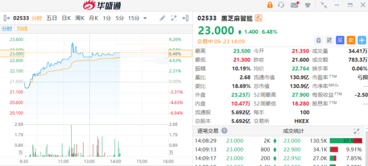 黑芝麻智能 $02533.HK 盘中一度涨近9%,截至发稿,涨6.48%,报23港元,成交额783万港元。