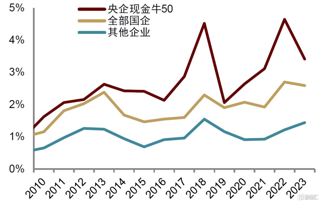 央国企加快进入新兴战略产业,或享有成长性估值溢价,中长期投资价值进一步凸显。2023年以来,国务院国资委提出到2025年央企战略性新兴产业收入占比要达到35%的目标[9]。脱虚向实叠加经济转型和产业升级背景下,央国企未来将承担更多产业升级的任务。随着更多推动政策落地,央国企加快入局战略性新兴产业意味着在现金流溢价之外,或将同时享有成长性估值溢价。中短期来看,现金流溢价提高支撑央国企估值中枢抬升;长期来看,央国企将受益于新一轮改革和积极响应政策带来的增长空间。