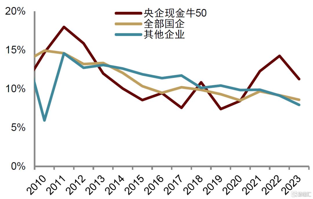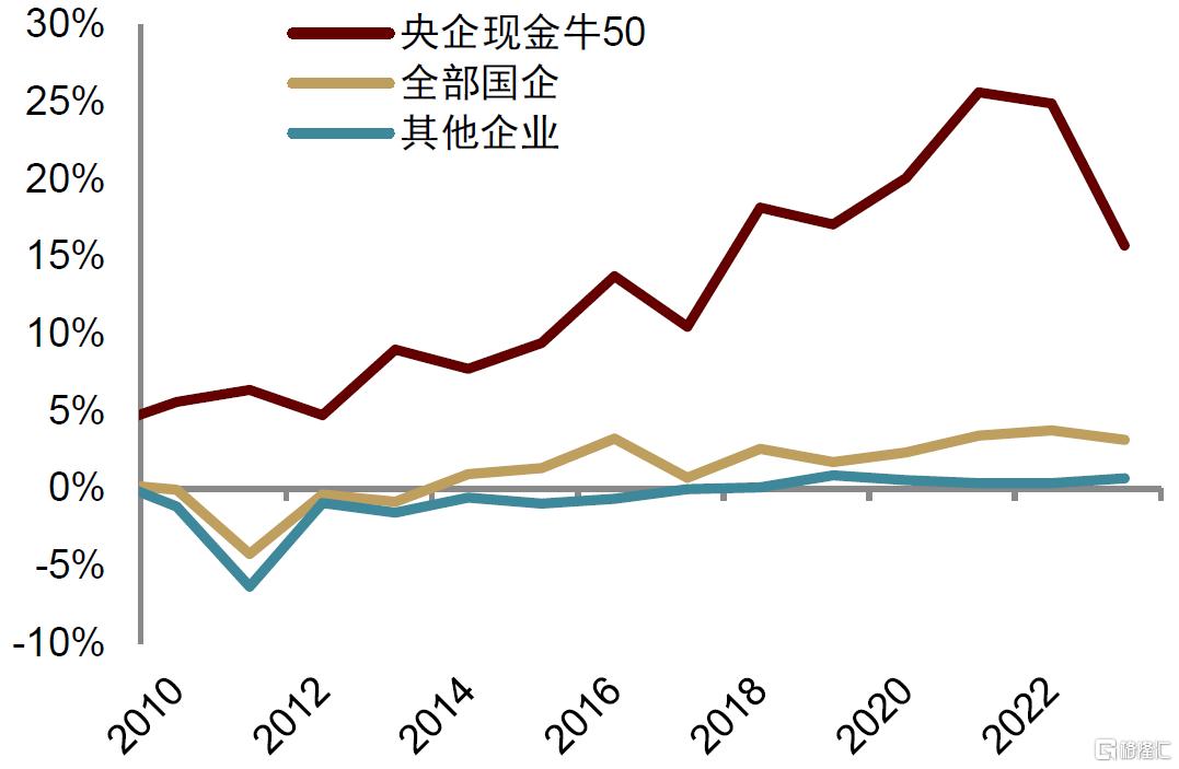 在“三重溢价”加持下,央企现金牛指数财务指标领先其他企业,并跑赢大盘。基于自由现金流比率,中金研究筛选出前50的央企来构建央企现金牛指数。该指数同时享有稳定现金流、央国企改革和产业成长性“三重溢价”(图表13)。首先,根据筛选原则,央企现金牛的自由现金比率远高于其他国企和企业[10](图表14);其次,较好的现金流量情况使得企业更有意愿和能力提高分红(图表15);最后,稳定的现金流意味着企业具有较好的盈利能力,特别是2020年以来,央企现金牛ROE水平显著提升并高于其他企业(图表16)。在“三重溢价”加持下,2023年以来,央企现金牛显著跑赢A股现金牛指数和大盘,在当前市场环境下呈现出较强的韧性。