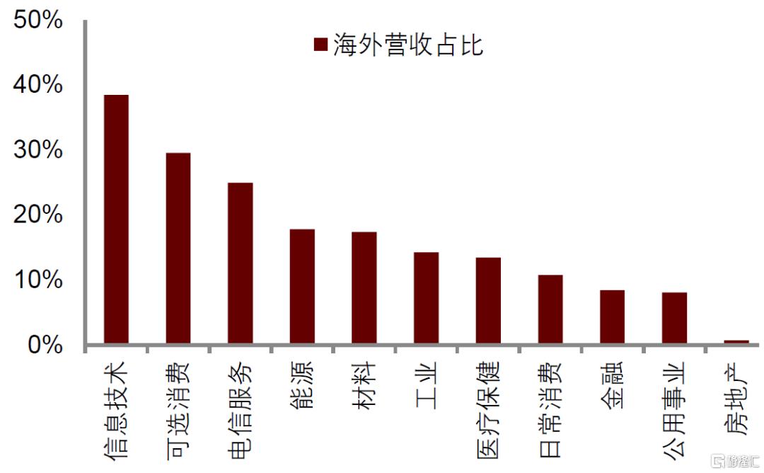 图表20:可选消费、电信服务、能源等现金牛行业海外营收占比同样较高