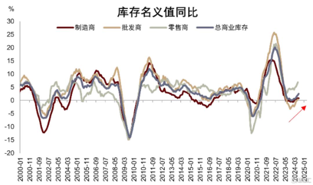 自今年6月以来,中金研究始终判断美国宽财政+浅降息的政策组合将利好美国顺周期板块接棒科技股[3]。中金研究认为支撑美国需求韧性的底层因素仍在发力(详见《2024年破立之间:海外市场的共识与变数》),同时美联储在9月开启降息将降低融资成本从而推升美国更广泛的需求复苏,提升顺周期行业的盈利、更利好分子端。其一,终端需求仍维持较高速扩张。美国居民的杠杆率与债务负担均为过去四十年以来最低[4],7、8月份美国财政显著再发力[5],使得24财年赤字率大概率高达7%,同时受益于美联储降息预期带动美国消费贷的利率下降,叠加近期的美国工资环比增速抬升,这些都指向美国终端需求稳健增长。二季度耐用品消费环比增长从总量到各分项明显加速,7、8月零售数据亦超预期扩张。在终端需求拉动下,上游中游的订单和销售的环比增速近几个月趋势抬升,比如制造业的订单、制造商和批发商销售等。其二,融资条件趋松叠加整体及多数行业库存偏低,看好补库和资本开支周期延续上行(图表4和5)。随着美联储开启降息,银行业继续放松信贷条件,工业设备投资周期重启在即,有望接棒厂房建设拉动资本开支周期继续上行。综上,伴随需求复苏,盈利主导的顺周期行业更具弹性。