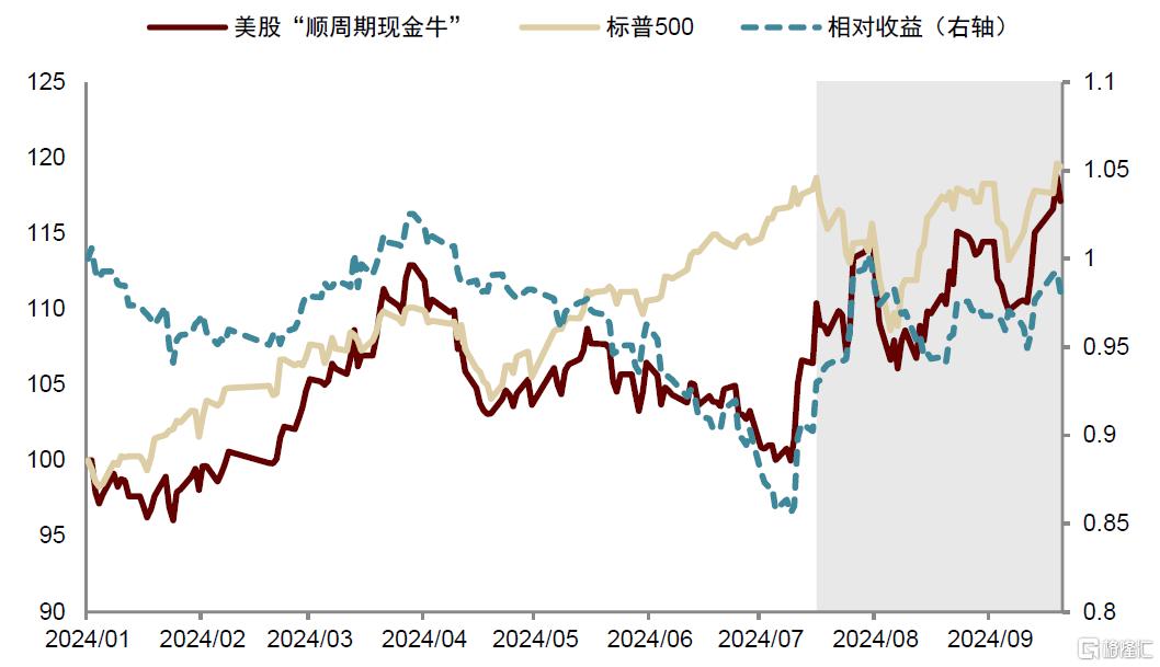 A股边际影响或较小,市场仍以国内基本面为主,攻守兼备的现金牛风格不变,并将向央国企进一步收敛。美联储预防式前置式降息的背景下,反而加剧长端美债利率上行压力,中美长端利差难以显著收窄。叠加去全球化、去金融化的新宏观范式背景下,美联储预防式降息或难以带来大规模的外资回流和国内市场流动性的显著改善。在金融周期下半场,内生动能偏弱,市场主要矛盾仍在分子端盈利,因此具有需求韧性和能产生稳定现金流的标的仍将享有确定性现金流溢价。边际变化上,国内经济复苏较缓,市场情绪偏谨慎,央国企天然具有较稳定的需求端,同时在国企改革和成长性助力下,现金牛风格出现向央国企进一步收敛的趋势。此外,建议继续关注美国顺周期对A股的外溢和拉动,具体关注两条主线:1)反映家庭部门需求韧性的耐用品,如五金水暖、家具家居、家用设备等;2)反映设备投资和制造业周期的计算机电子设备、工业设备、化学制品、煤炭石油制品等。