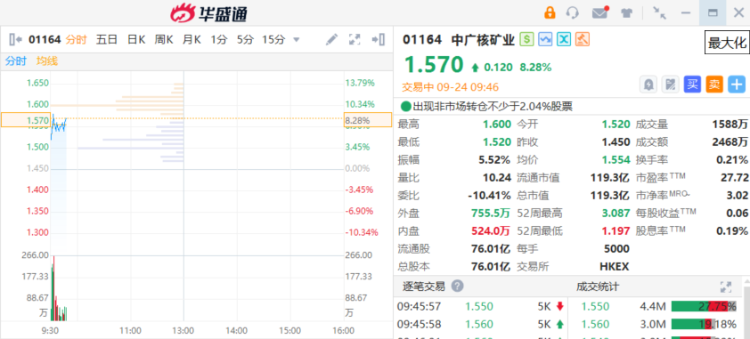中广核矿业 $01164.HK 一度涨近9%,截至发稿,涨8.28%,报1.57港元,成交额2468万港元。