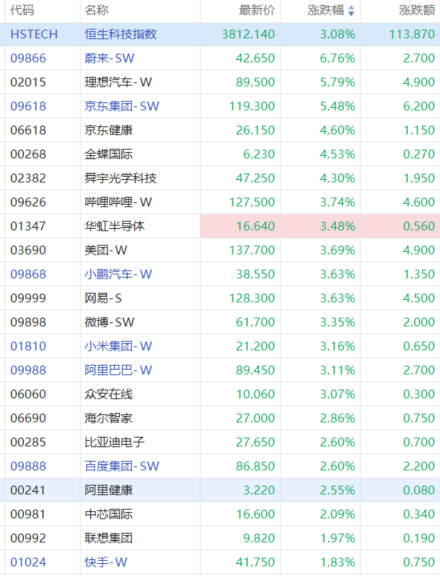 成分股中,蔚来涨超6%,理想汽车、京东涨超5%,京东健康涨超4%,哔哩哔哩、华虹半导体、美团、小鹏、小米、阿里巴巴涨超3%,百度涨超2%,快手涨超1%。